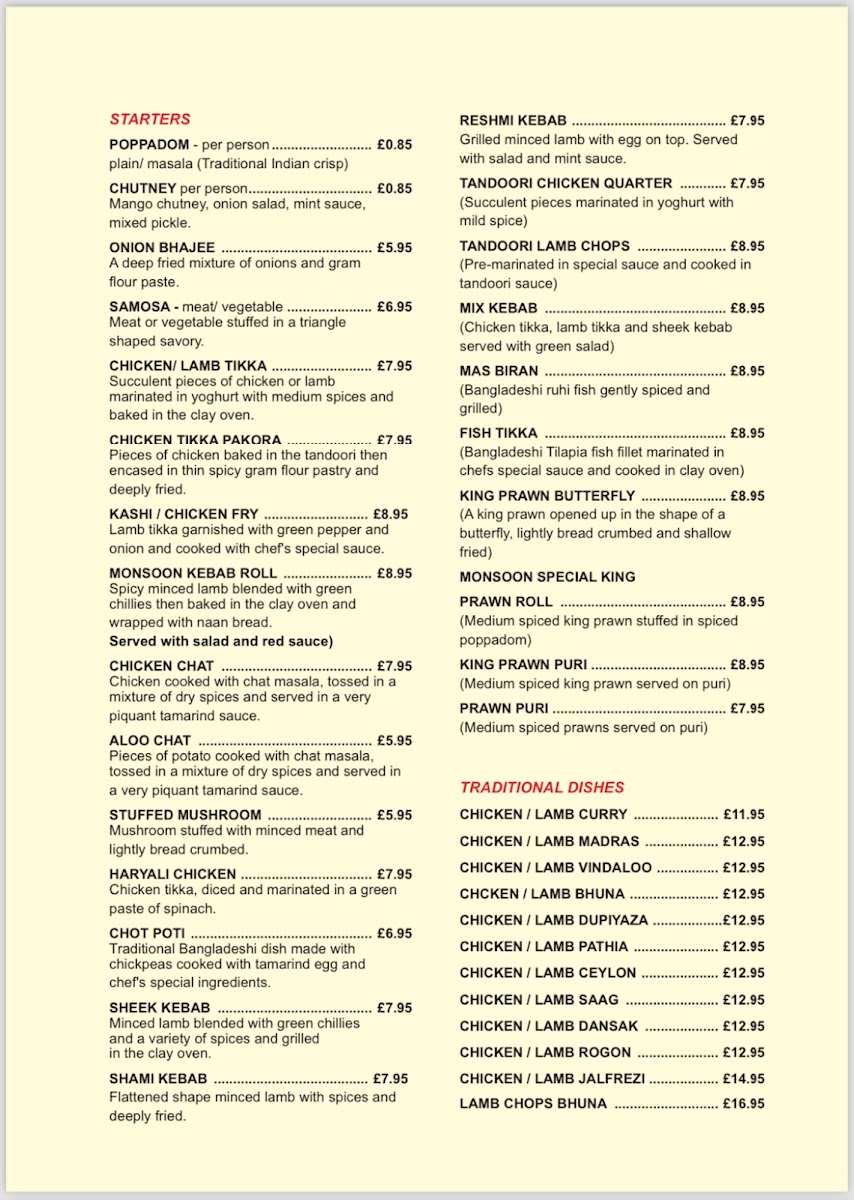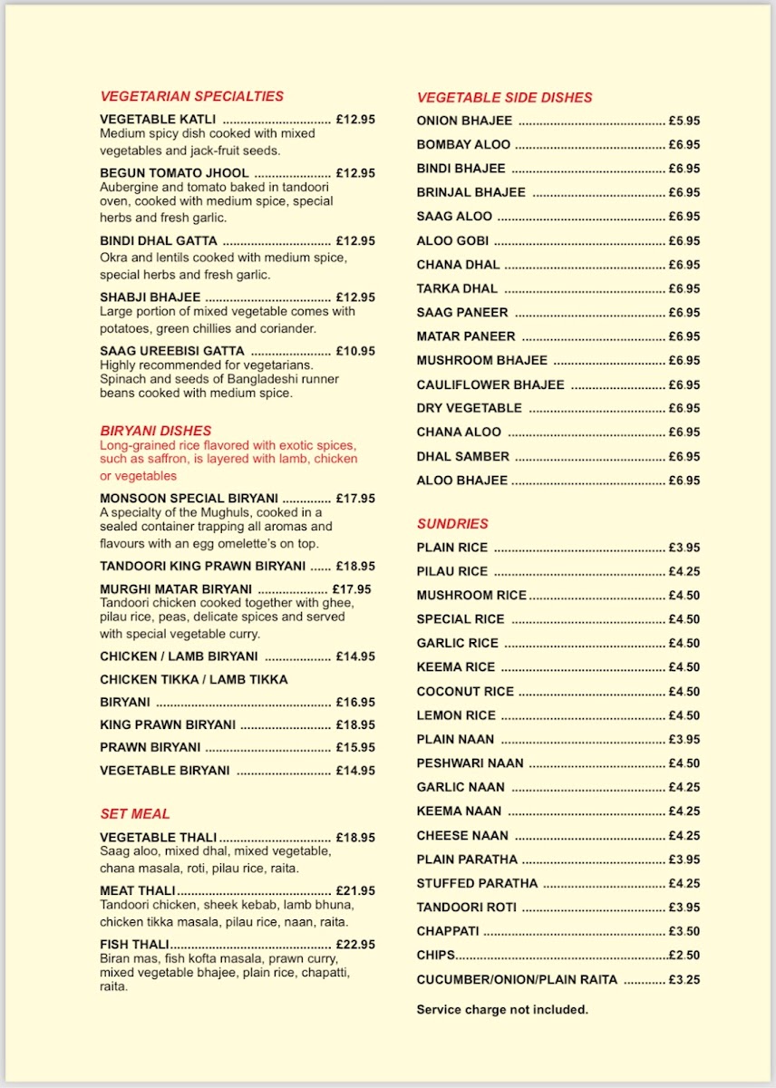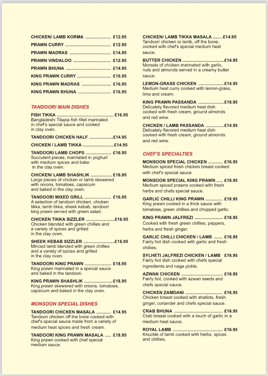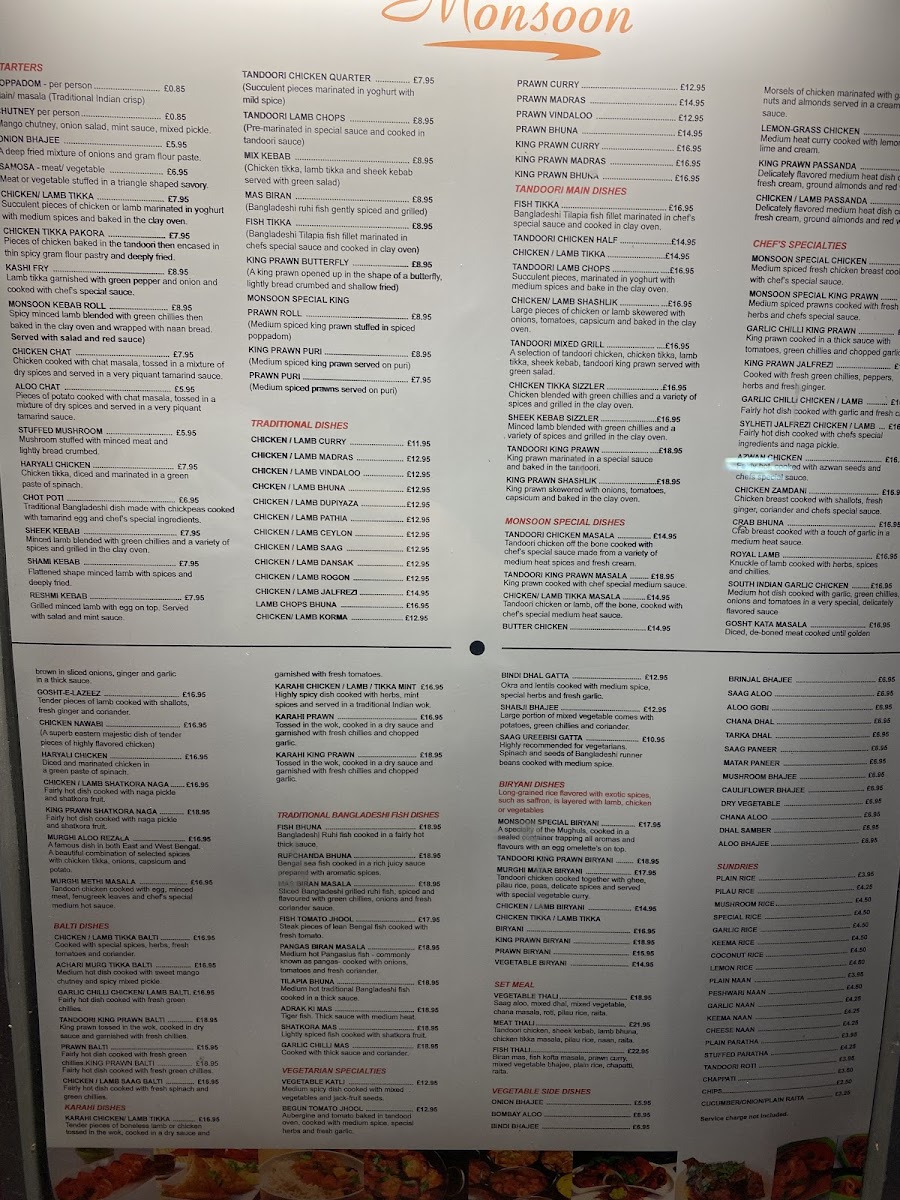What sets The Monsoon apart is its attention to detail in the preparation and presentation of each dish. The spices are always well-balanced, never overpowering, and the ingredients are fresh, ensuring that every bite delivers an authentic taste of India. The restaurant’s commitment to quality extends to its service, with friendly and knowledgeable staff who are always eager to recommend dishes and help navigate the extensive menu.